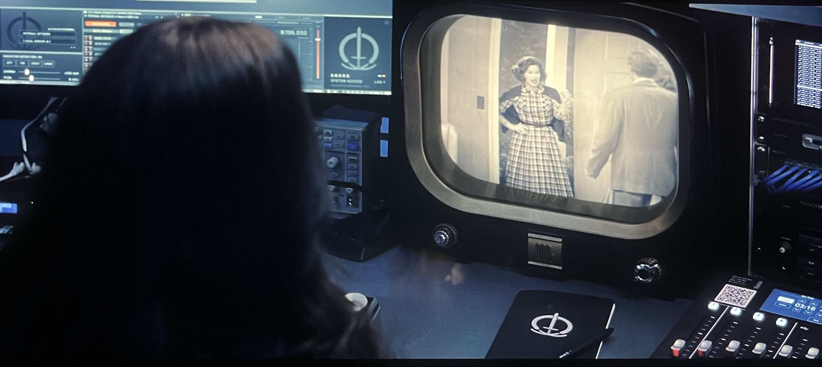 그 후 토르에 나왔던 달시 루이스가 등장하고 그녀는 소드 베이스 캠프에서 엄청난 양의 cmbr(우주 마이크로파 배경 복사)을 발견하고 방송주파수를 잡아 구식 브라운관 tv에 연결하여 완다와 비전이 나오는 시트콤을 재생시켜 그들을 관찰하기 시작합니다. 시트콤의 사람들이 실종된 사람들임을 알게되고 요원을 지하를 통해 마을로 보내지만 옷은 양봉업자로 바뀌고 드론도 장난감 헬리콥터로 변합니다.모니카는 제럴딘으로 완다의 옆에 있었지만 현실의 울트론을 언급하고 그녀에게서 외부에서 침입한 자라는 말을 듣고 현실로 튕겨져 나옵니다. 그 중간 과정은 tv에 나오지 않다 모니카가 현실로 튕겨져 나온 이후 방송됩니다. 제럴딘이 어디 갔는지 물어보는 비전을 돌아보니 타노스에게 살해당했던 모습이어 놀란 완다는 다시 보니 멀쩡한 모습으로 돌아와 있습니다. 이 곳에 살 필요가 없고 어디든 갈 수 있다고 말하는 비전에게 완다는 우리는 그럴 수 없다고 말합니다. 완다는 여기가 우리 집이고 본인이 다 해결하겠다고 말합니다.모니카는 웨스트뷰에서의 복장으로 완다라고 하며 모든게 완다라고 합니다.
